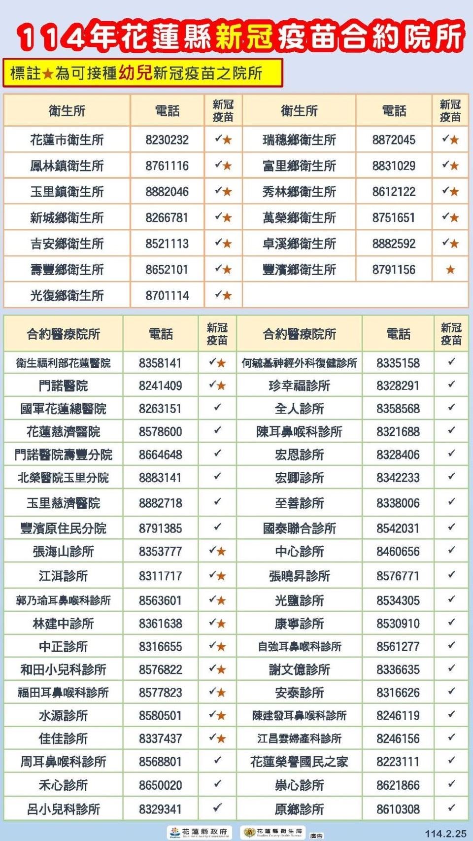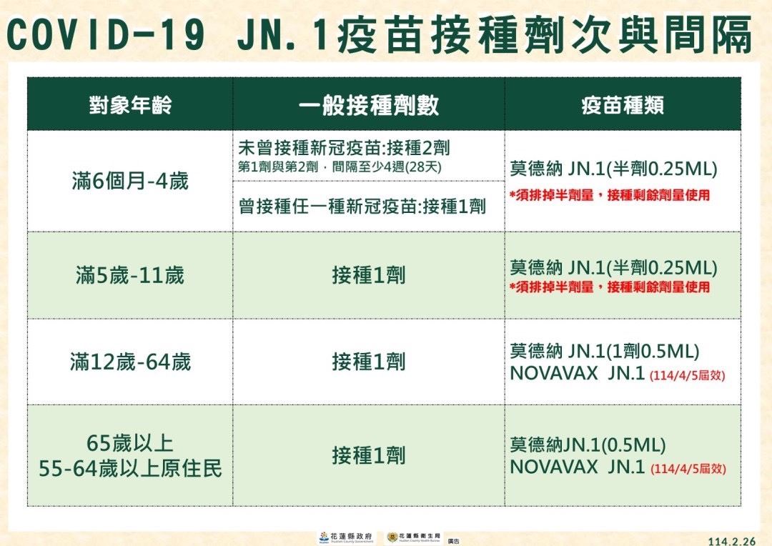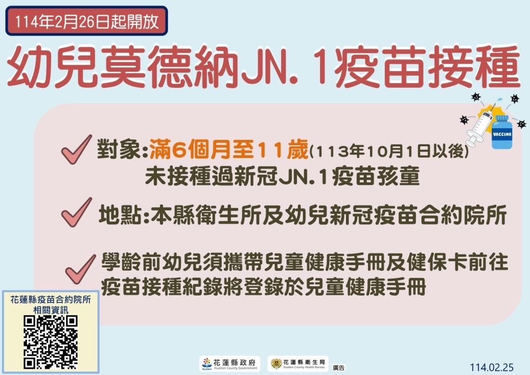全國COVID-19門急診就診人次2025年第8周較第7周<10-19歲>增加45.5%,1130901迄1140223新冠併發重症累計499案,死亡106案,未接種JN.1疫苗佔98.5%) 為家人們健康呼籲家長盡速帶小孩及家人施打新冠疫苗 ★溫馨提醒 本所施打時間及年齡: 1.滿6個月至12歲以下每星期二早上0830-1100(記得攜帶健保卡及兒童健康手冊) 2.12歲以上每星期二早上0830-1100/下午1400-1600(記得攜帶健保卡) 豐濱衛生所愛護您!