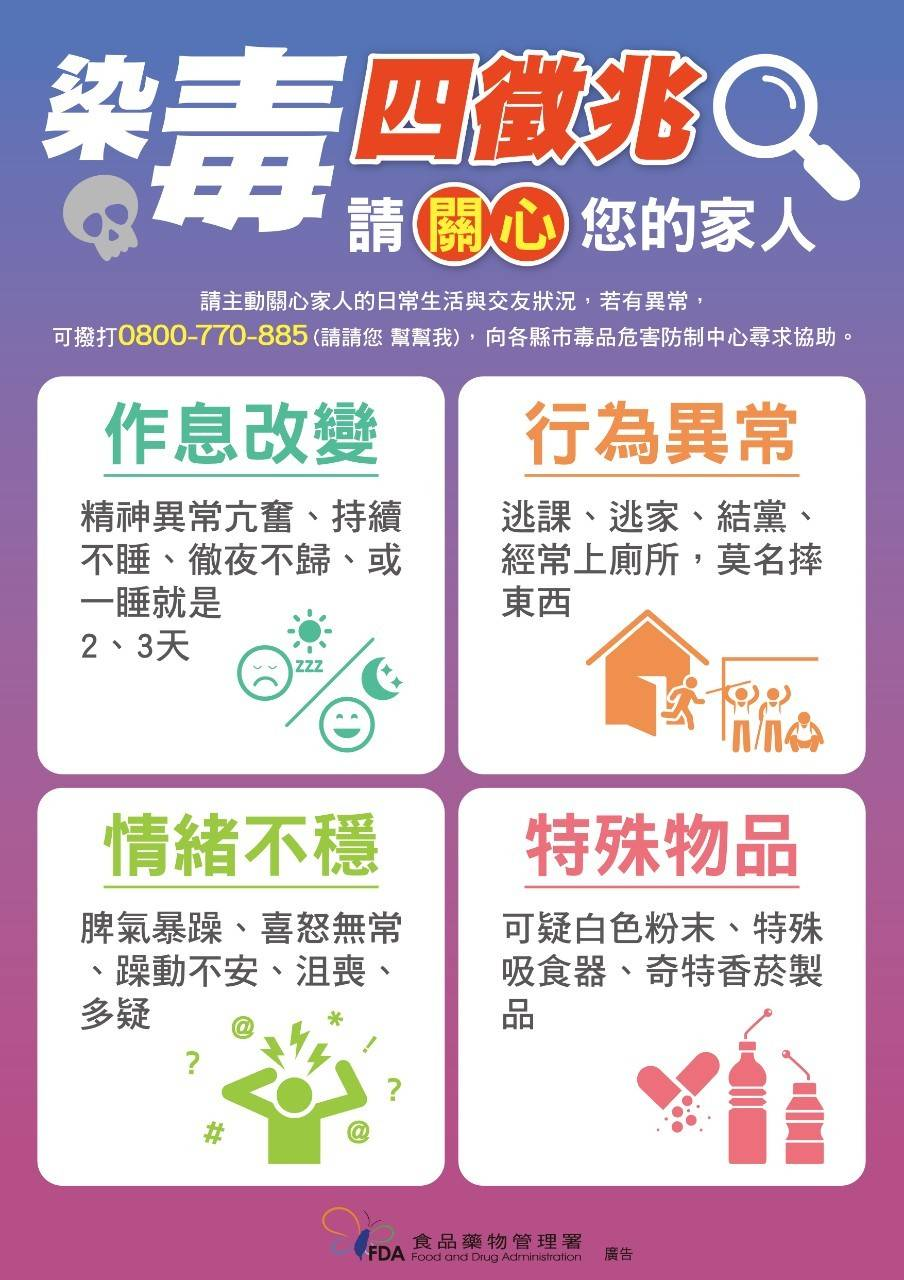 請主動關心家人的日常生活與交友狀況,若有異常,可撥打0800-770-885(請請您:幫幫我),向各縣市毒品危害防制中心尋求協助。