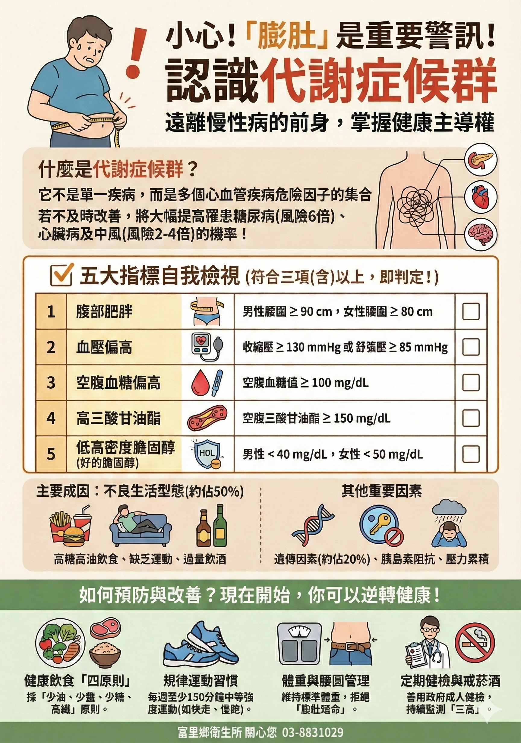 如果您符合上述指標,建議儘速尋求專業醫療諮詢,或至參與「全民健康保險代謝症候群防治計畫」的診所追蹤。