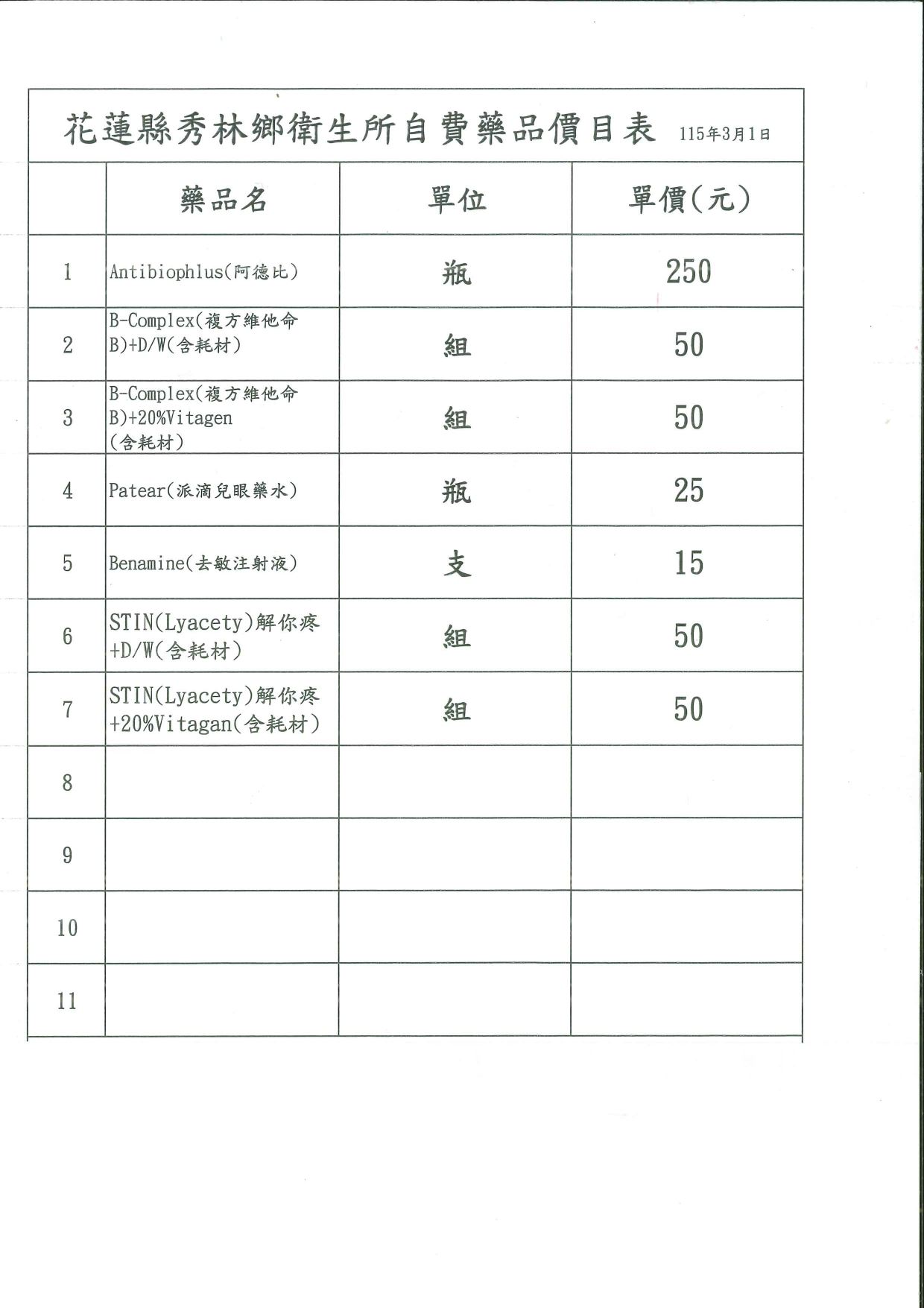 花蓮縣秀林鄉衛生所自費藥品價目表